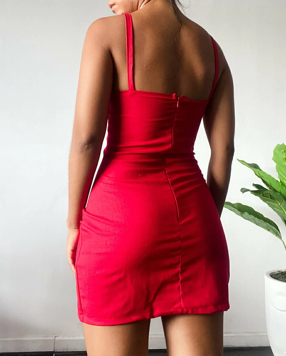 Vestido curto com decote franzido.