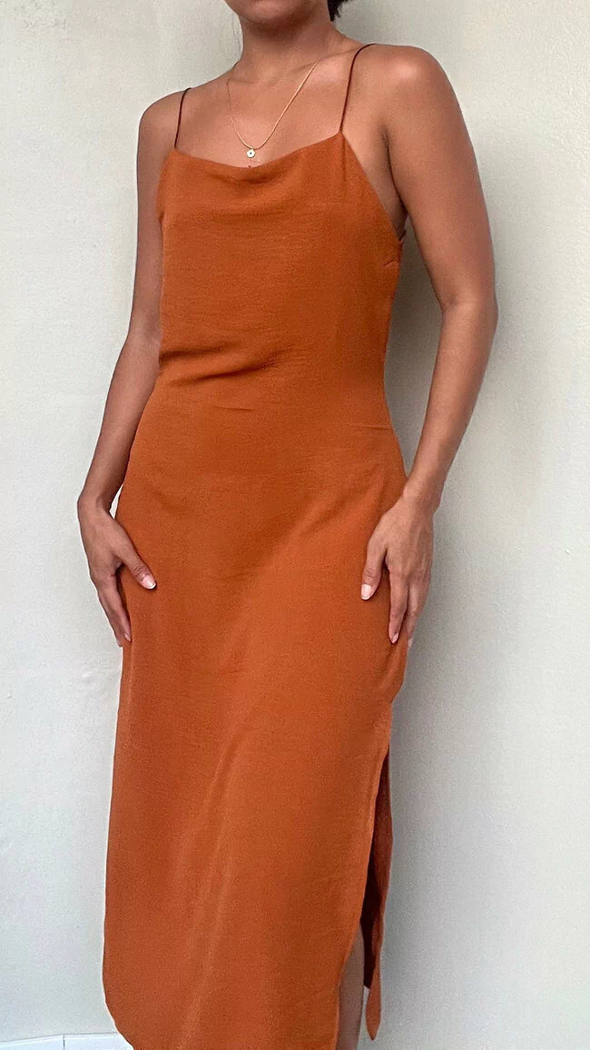 Vestido mídi com decote reto levemente caído nos seios, modelagem mais soltinha, costas retas com zíper invisível e duas fendas laterais.