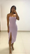 Modelagem com busto reto forrado duplo, alças embutidas acetinadas. Saia com fenda frontal,