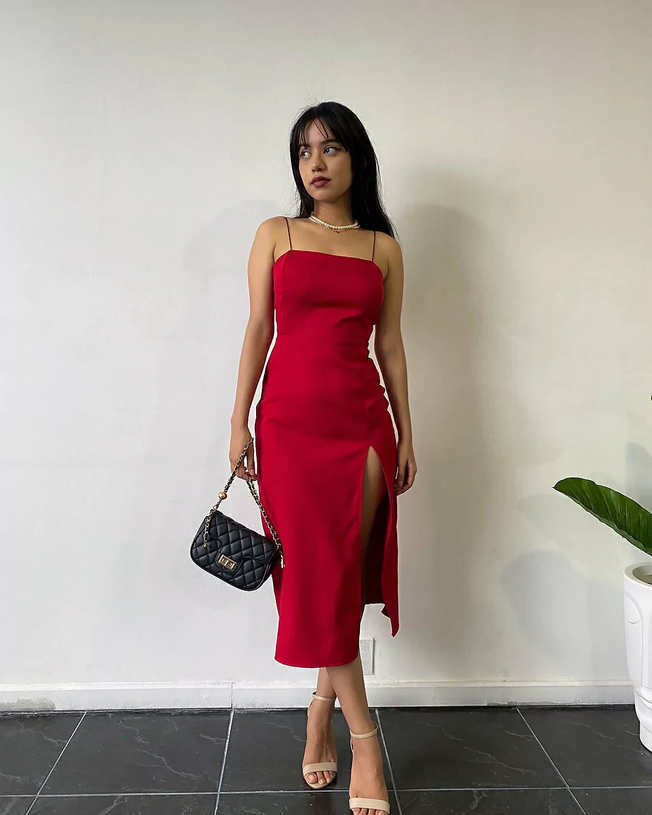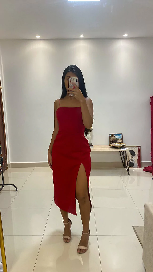 Modelagem com busto reto forrado duplo, alças embutidas acetinadas. Saia com fenda frontal,